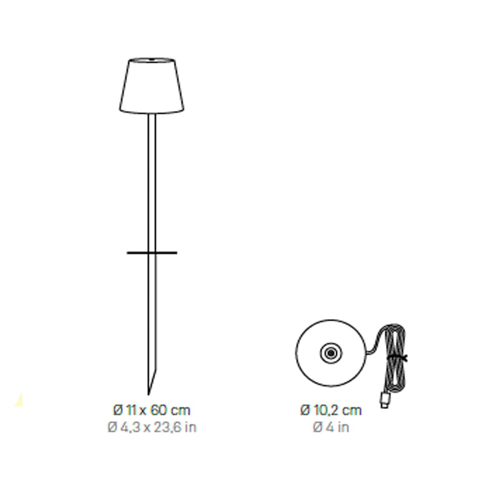 Poldina Picket with magnetic head is a battery-operated, portable and rechargeable lamp with picket. In the upper part of the head there is a “touch” control, which allows switching on, adjusting the light intensity and selecting the color temperature of the light between 2200 K, 2700 K and 3000 K. Thanks to a high index of protection, the lamp can also be used outdoors. It is equipped with a magnetic head that can be easily removed and recharged conveniently on its contact charging base; charger Includesd. Battery life is guaranteed for more than 9 hours. As accessories, additional rods that allow you to increase the height of the lamp are available for purchase. It is possible to customize the lamp with ceramic covers, which can be purchased separately.