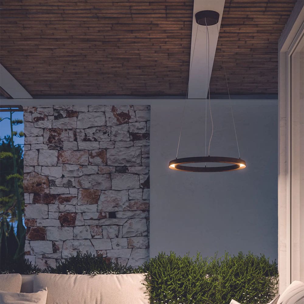 Lira PR is the round suspension version of the Lira family. LED suspension lamp with a circular shape, with painted aluminum body and white polyurethane resin diffuser. Lira P is suitable for outdoor applications thanks to the high degree of protection against dust and water jets. This product is available in two finishes, black or dark brown, both designed to blend in with the external environment.