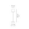 Light source: LED 1,8W – 2200-2700-3000 K – 174-177-195 lumens – CRI>80 – 100-240V – TOUCH DIMMER – IP65. battery 5Vdc max 1A. Contact charging base included. Dimensions: Ø 7 cm H 27,5 cm