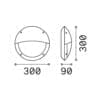 Light source: E27 max 1 x 23 W (bulb not included) – 220-240V – dimmer determined by the bulb – IP66. Dimensions: W 90 mm Ø 300 mm