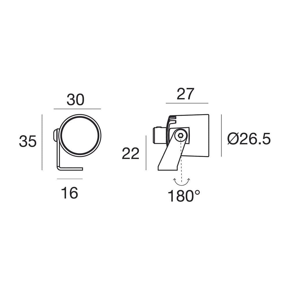 Light source: 1 x powerLED 2W – 249 lumens – 3000 K – CRI=80 – 630 mA – IP65. Dimensions: H 35 mm L 27 mm W 30 mm
