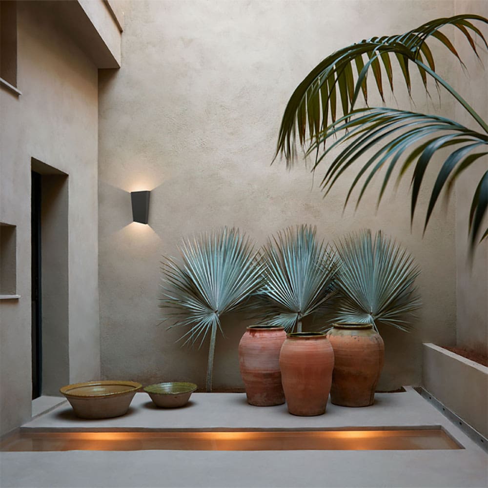 Break plus 4116, designed by Xuclà and produced by the Vibia brand, is an outdoor wall lamp. This lamp, which resembles a tile or brick, was designed to integrate into the architecture of any space. The matte lacquer finish adds a granular touch that complements the geometric shape. The Break Plus wall lamp turns any surface into a three-dimensional mural. Whether in composition or installed individually, this lamp is characterized by a series of cubic and cylindrical volumes that project a diffused and indirect light upwards and downwards or in both directions. The surface-mount, easy-to-maintain Break Plus outdoor lamp is suitable for both private homes and large commercial projects, as its matte lacquer finish adds a touch of graininess that goes well with its geometric shape.