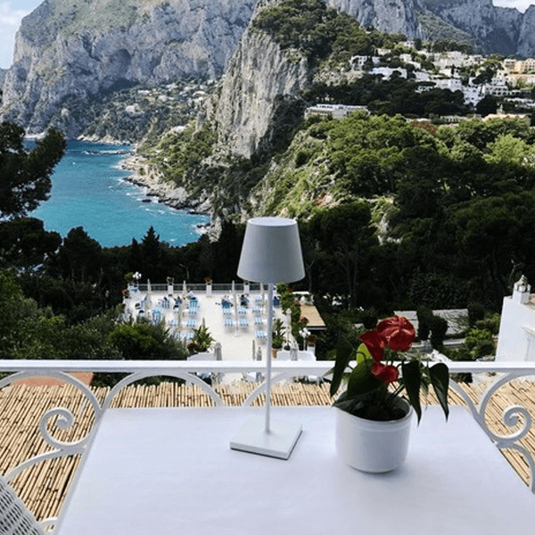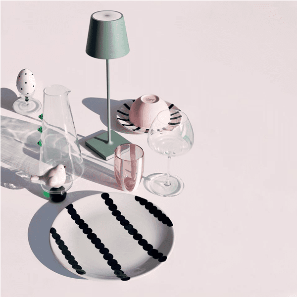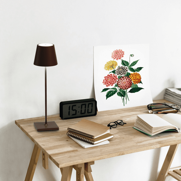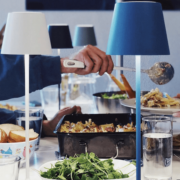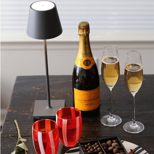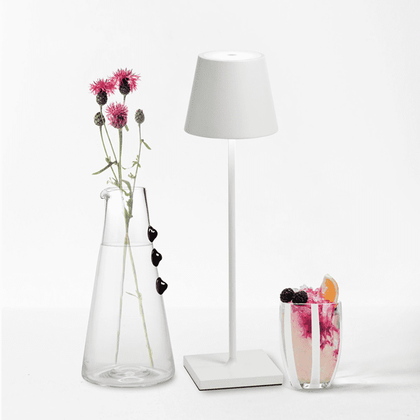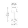 Lampada ricaricabile da tavolo dotata di base di ricarica a contatto, con corpo in alluminio verniciato, diffusore in policarbonato e fonte luminosa a LED.La collezione