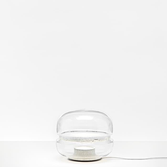 La lampada da tavolo Macaron rende omaggio alla bellezza e alle complesse strutture della pietra cristallina. Racchiusa in cupole opposte di delicato vetro soffiato a mano, la pietra diventa un paesaggio lunare a galla nel proprio cosmo. La sorgente luminosa proietta il suo bagliore verso l’alto dalla base in onice per energizzare le tortuose vene di calcedonio nella piastra centrale in onice e creare un effetto luminoso sottile e affascinante.