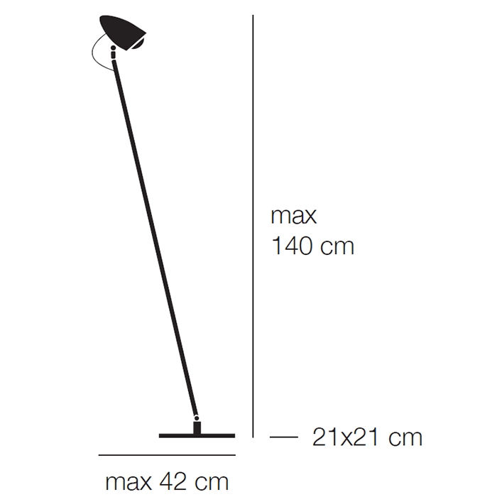 Sorgente luminosa: COB LED 1x5W a basso voltaggio 2700k – lumen 600 – CRI80 – 220-240V plug driver con spina EU, touch dimmer incluso. Dimensioni: base 21×21 cm, H max 140 cm