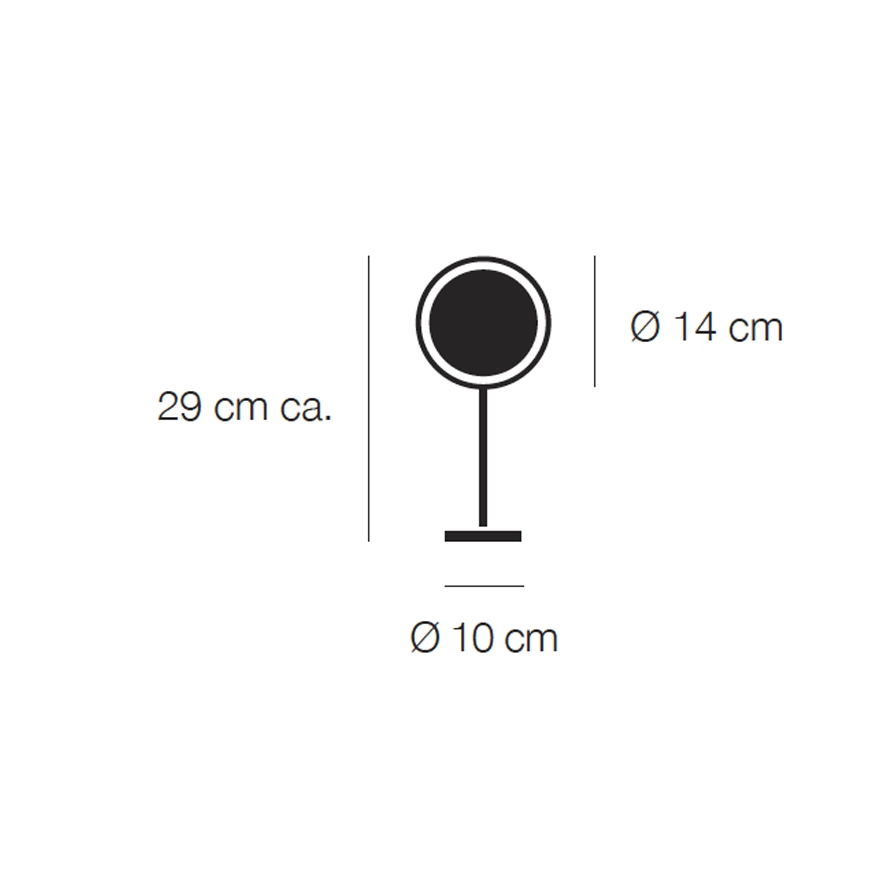 Sorgente luminosa: LED flessibile 1x6W 2700k – lumen 2187 – CRI>80 – 110-240V* – plug driver con dimmer su cavo. Dimensioni: base Ø 10 cm H 29 cm schermo Ø 14 cm