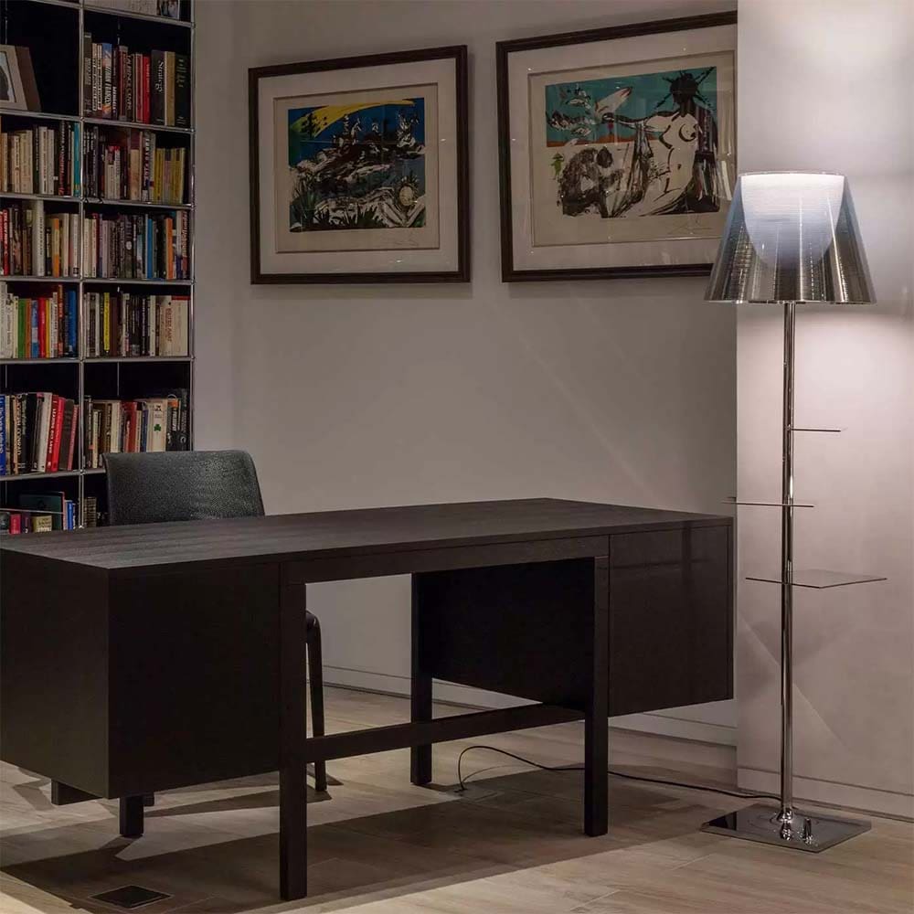 Bibliothèque Nationale Terra, disegnata da Philippe Starck, è una lampada da terra a luce diffusa, perfetta per ambienti moderni. La struttura è composta da una base in zama pressofusa cromata e una copertura in lamiera d’acciaio zincata. Il diffusore interno è in PC opalino, mentre quelli esterni sono disponibili in diverse finiture: tessuto PVC, metacrilato trasparente o grigio fumé, oppure metallizzati grigio o bronzo. Le mensole in acciaio inox lucido integrano la lampada, rendendola funzionale e raffinata. Un connettore USB sulla base consente la ricarica di dispositivi mobili. Con il suo design elegante e la combinazione di materiali di alta qualità, Bibliothèque Nationale Terra non è solo una lampada, ma un oggetto di design versatile che aggiunge un tocco sofisticato a qualsiasi ambiente.