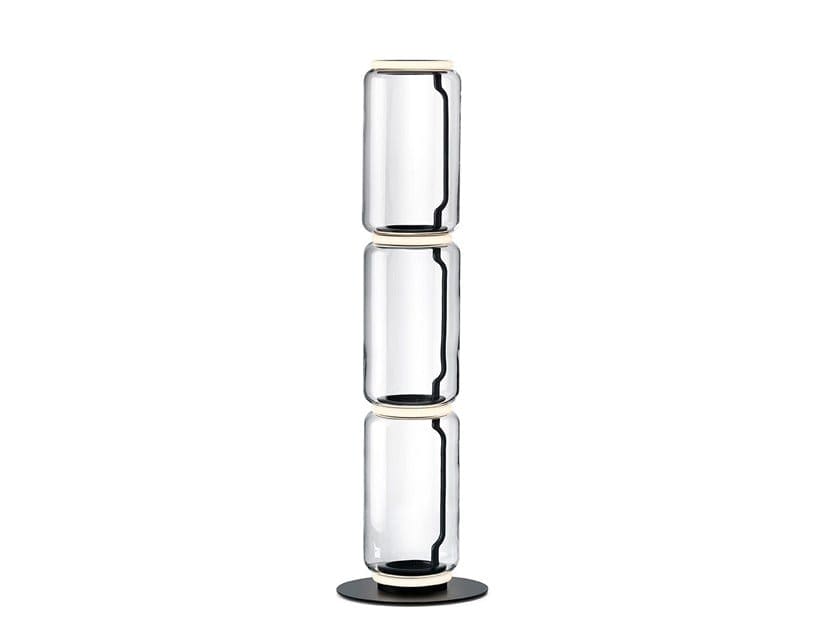 Lampade da terra costituite da moduli di vetro interconnessi che raggiungono un’altezza di 2,17 metri (85,43 “). Struttura in vetro soffiato trasparente cilindrico e semisferico, alluminio pressofuso base e anelli mini, bracci laterali interni in acciaio idroformato e diffusori ad anello esterno in silicone opale stampato ad iniezione. Il cavo di alimentazione è lungo 2 metri (78,74 “), con un pannello a pedale utilizzato come dimmer per regolare l’intensità della luce dal 10% al 100% in entrambe le direzioni. Alimentatore da parete con spine intercambiabili