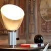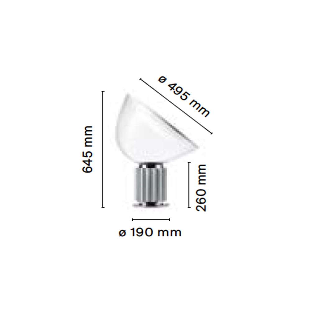 TACCIA SMALL รจ una lampada da tavolo a luce indiretta e riflessa. Riflettore in metallo verniciato di colore bianco lucido a liquido internamente e bianco a polvere esternamente. Diffusore orientabile in vetro trasparente soffiato a bocca. Corpo in alluminio estruso verniciato di colore nero opaco o anodizzato argento. Base di acciaio lucidato, nichelato e zapponato. Disponibile in diversi colori