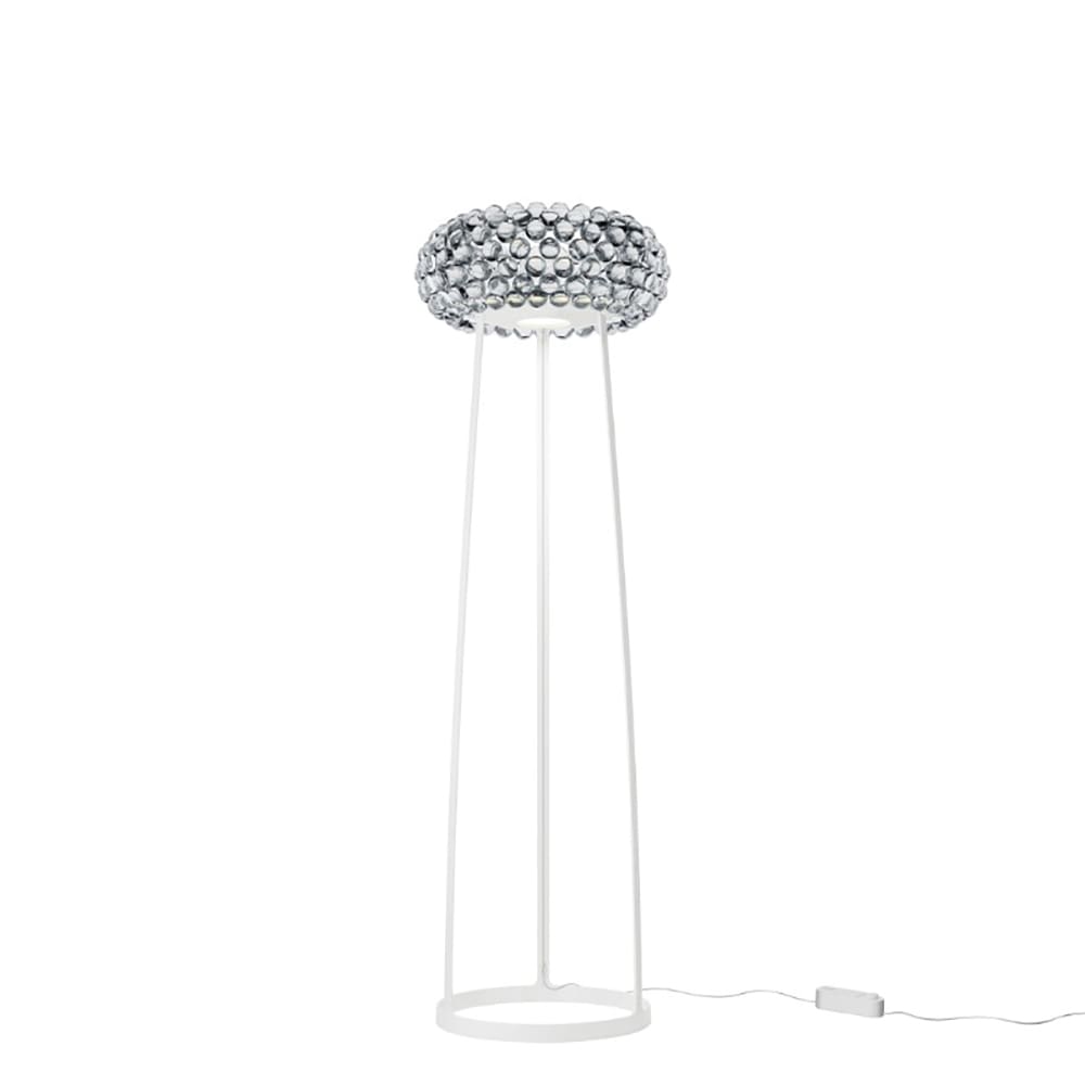 Caboche Plus Terra del marchio Foscarini, design di Patricia Urquiola con Eliana Gerotto, รจ una lampada da terra disponibile in 2 dimensioni, perfetta per arricchire qualsiasi ambiente con un tocco di eleganza scintillante. Questo gioiello di design combina una base in metallo dal disegno circolare, che richiama la forma del diffusore, con una struttura composta da archi in PC trasparente e sfere in PMMA, applicate con il sistema innovativo twist lock.