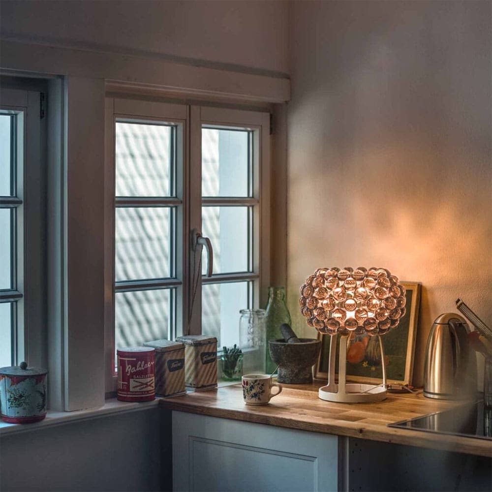 Caboche Plus LED Tavolo, del marchio Foscarini, design di Patricia Urquiola con Eliana Gerotto, è una lampada da tavolo a luce diffusa e diretta, ideale per ambienti sofisticati. Il diffusore interno è realizzato in vetro soffiato satinato, completato da uno schermo inferiore in vetro opalino satinato. Il diffusore esterno è formato da archetti in policarbonato e sfere in polimetilmetacrilato, fissati su una montatura in metallo cromato. Base e aste in alluminio pressofuso verniciato a polvere conferiscono solidità e leggerezza al design. Il dimmer, posizionato sul cavo trasparente, permette di regolare l’intensità luminosa. Come un gioiello luminoso, Caboche Plus LED Tavolo aggiunge eleganza e brillantezza a qualsiasi spazio, rendendolo unico e accogliente.