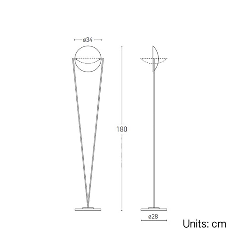 Sorgente luminosa: LED COB (incluso) – 40W – 3000k – 110/120-or-220/240V – 3100 lumen – CRI >90 – IP20 – dimmer sul cavo incluso . Dimensioni: Ć Diffusore: 34 cm Base: 28 cm H 180 cm