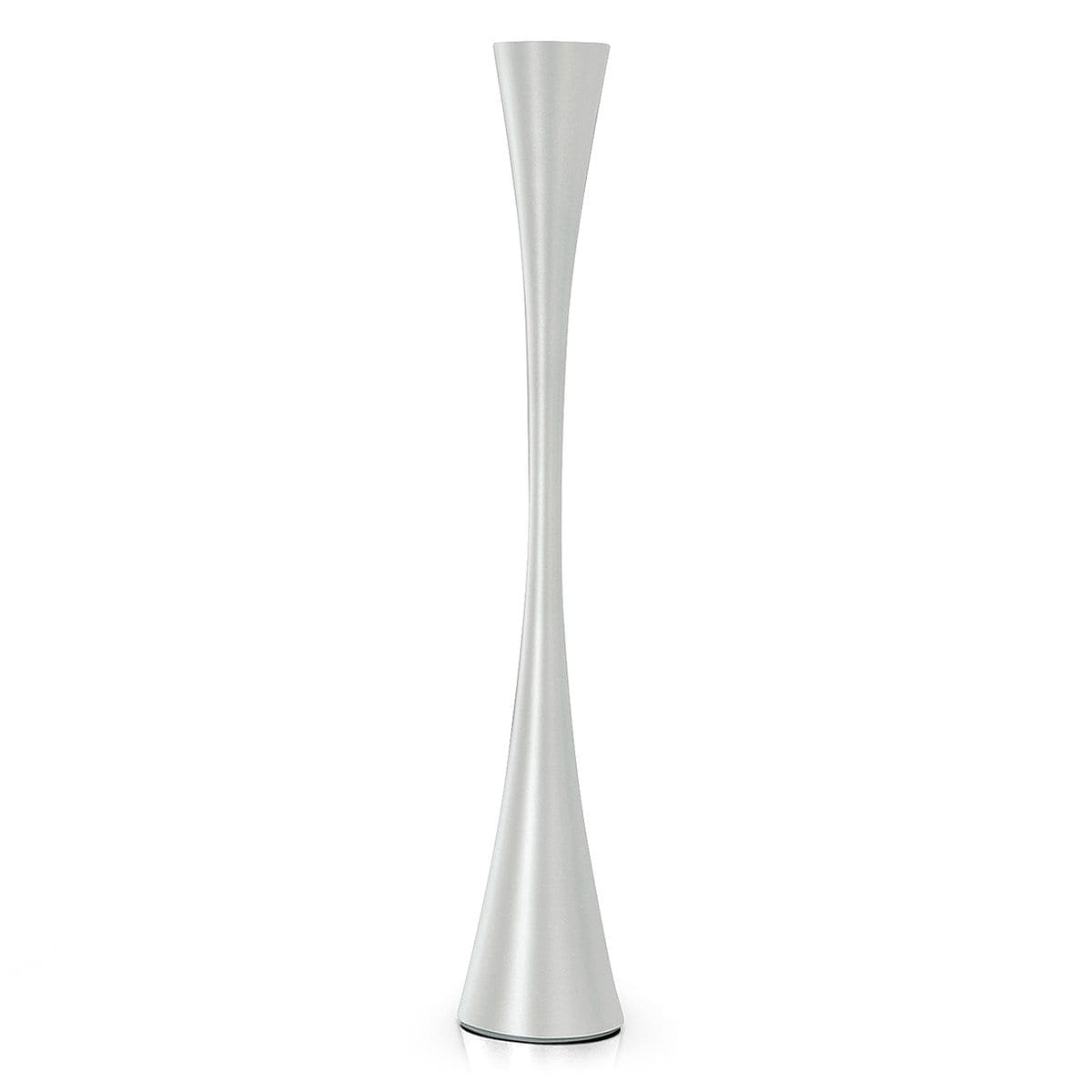 Lampada da terra a luce indiretta. Corpo stampato in resina verniciato nei colori bianco e nero. Oggi, proposta anche nel nuovo colore dorato. Diffusore in metacrilato opal bianco. Con regolatore d’intensità luminosa sul cavo. Sorgente di luce a LED integrato. Alimentatore elettronico dimmerabile nel corpo lampada.Disegnata da Elio Martinelli nel 1987 la lampada nasce dal vuoto generato da un anello di circonferenze quasi tangenti, a formare come un canale che mette in comunicazioni due mondi: il vecchio ed il nuovo millennio. La forma neoclassica ne permette l’inserimento in ogni tipo di ambiente e le dimensioni contenute non comportano problemi di spazio per la sua collocazione.