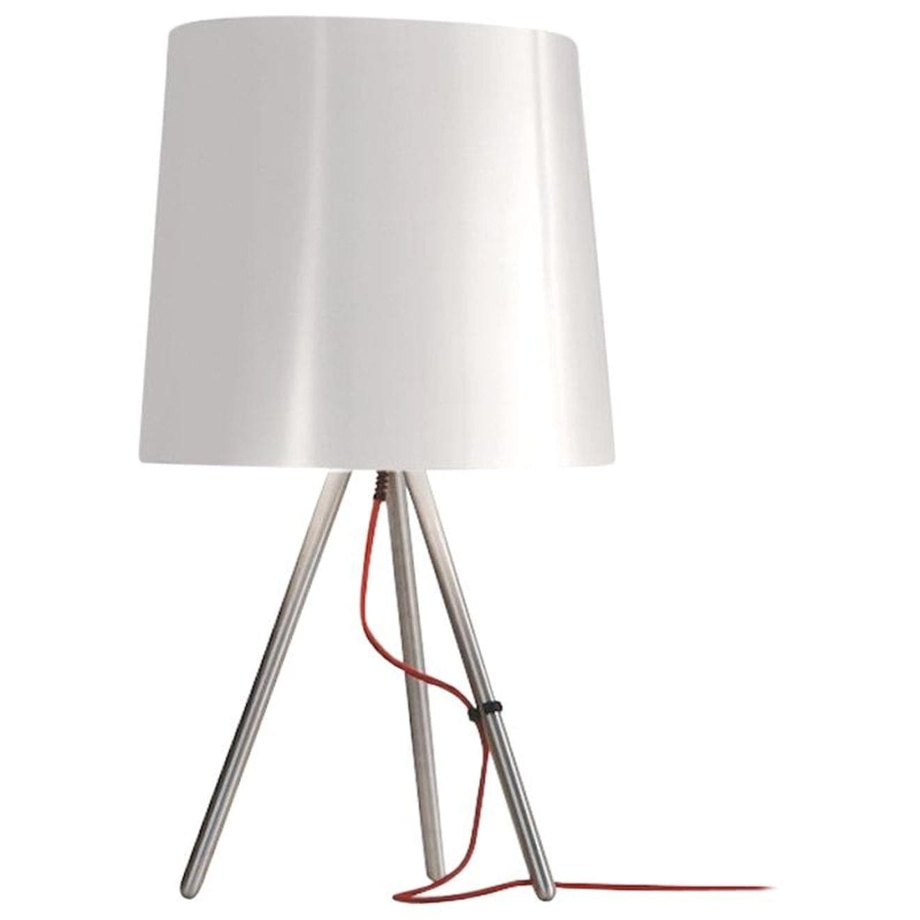 Lampada da tavolo a luce diffusa. Struttura in alluminio satinato con diffusore in tessuto nei colori bianco, nero o nella versione con struttura verniciata nel colore nero e diffusore in tessuto nero. Cavo di alimentazione nel colore rosso.Disponibile da tavolo in due dimensioni e nelle versioni da terra e a sospensione.Disegnata da Emiliana Martinelli nel 2007, Eva reinterpreta la tradizionale lampada con paralume in una visione moderna e anche tecnologica nella variante interamente in metallo. Una forma semplice che ispira tranquillità sia in un arredamento classico che di design.