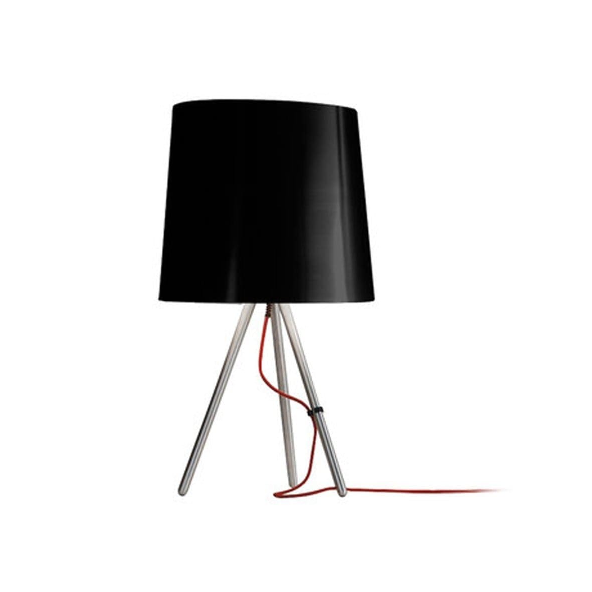 Lampada da tavolo a luce diffusa. Struttura in alluminio satinato con diffusore in tessuto nei colori bianco, nero o nella versione con struttura verniciata nel colore nero e diffusore in tessuto nero. Cavo di alimentazione nel colore rosso.Disponibile da tavolo in due dimensioni e nelle versioni da terra e a sospensione.Disegnata da Emiliana Martinelli nel 2007, Eva reinterpreta la tradizionale lampada con paralume in una visione moderna e anche tecnologica nella variante interamente in metallo. Una forma semplice che ispira tranquillità sia in un arredamento classico che di design.