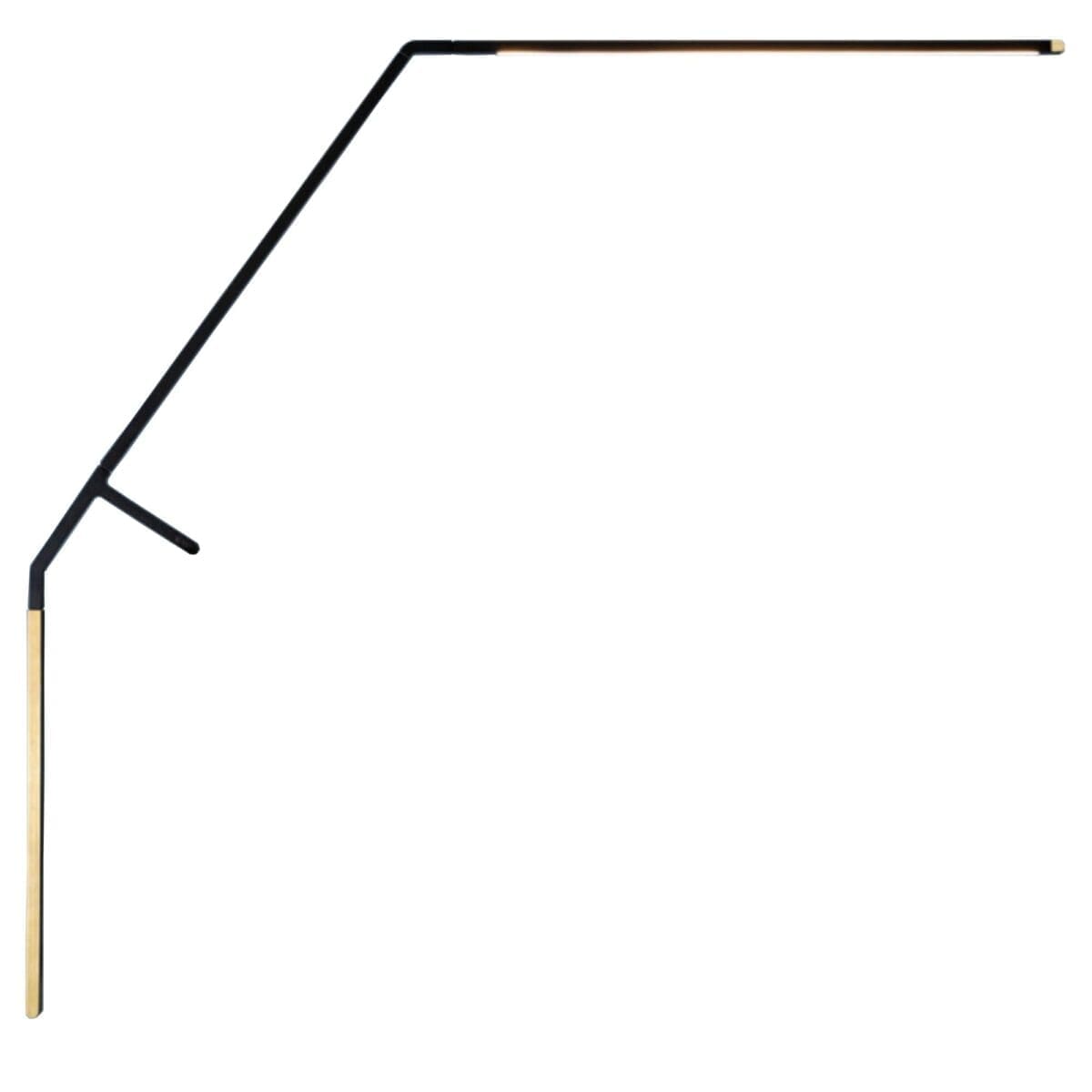 Lampada da tavolo LED in estruso di alluminio con elemento a T di appoggio in polimero caricato con fibre di vetro. Composta da un braccio sporgente verniciato nero opaco dove è localizzata la sorgente luminosa e da un contrappeso verticale in ottone. La lampada, collocata liberamente sul bordo di una superficie, oscilla e si muove ma ritorna sempre nella posizione orizzontale. Il modulo LED incorporato nel braccio ruota attorno al proprio asse rendendo la lampada versatile e fornendo un’illuminazione diretta e indiretta diffusa. Accensione e dimmerazione avvengono attraverso un sensore di prossimità.