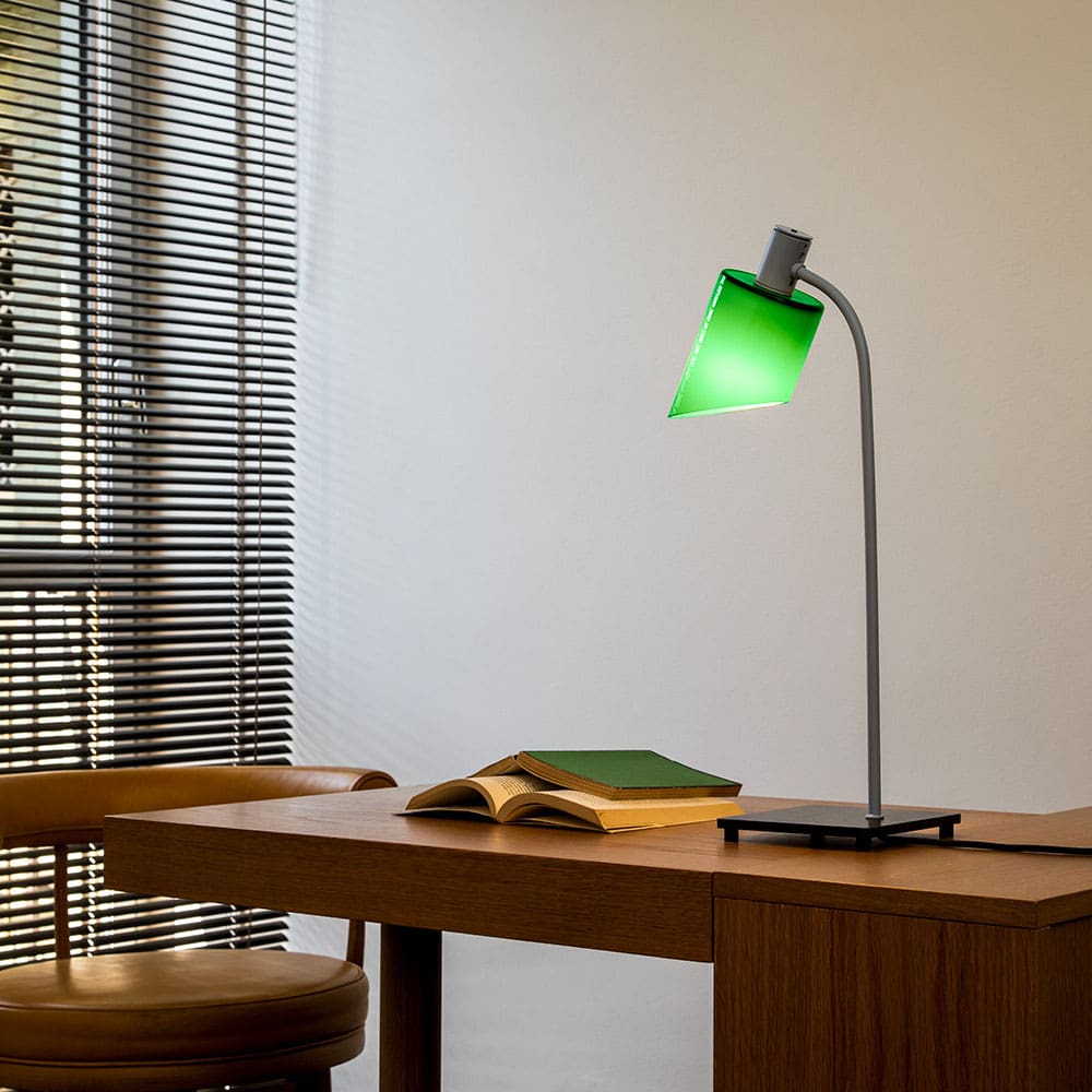 Lampe de Bureau è una lampada da tavolo disegnata da Charlotte Perriand e prodotta dal Brand Nemo. Dalla necessità di illuminare i volti riflessi nello specchio di un armadietto disegnato per la famosa vetreria francese Boussois, Charlotte Perriand crea nel 1965 la versione a parete della Lampe de Bureau, successivamente trasformata in lampada da tavolo. Questa lampada dalle forme geometriche semplici ma di straordinaria eleganza, è composta da un diffusore cilindrico inclinato, una struttura in alluminio e una base quadrata che la stabilizza saldamente al piano. L’estrema sintesi di questa lampada viene affiancata rigorosamente all’attenzione verso i dettagli, dando vita ad un prodotto fresco, leggero e di design. La Lampe de Bureau si presta benissimo a diversi stili d’arredo, si può inserire sopra una mensola di una parete attrezzata, una madia in salotto, su un comodino o su una scrivania di uno studio professionale restando sempre al centro dell’attenzione.Disponibile nelle finiture: grigio, blu, verde, rosso, bianco e giallo.