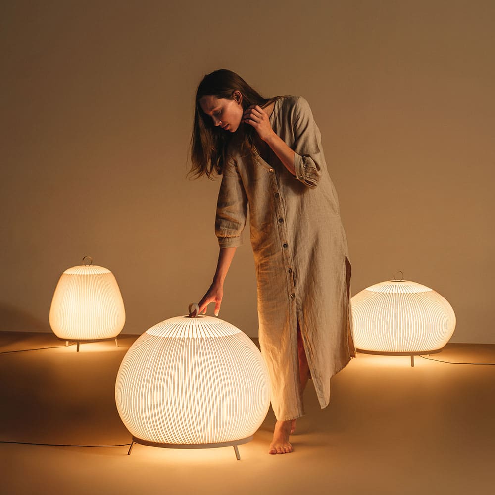 Knit รจ una lampada da terra creata da Meike Harde per il marchio Vibia. Disponibile in diversi modelli. Knit รจ una lampada da terra prossima in termini di dimensioni e che si fa notare grazie al suo paralume in tessuto. Un anello nella parte superiore ne agevola la portabilitร .