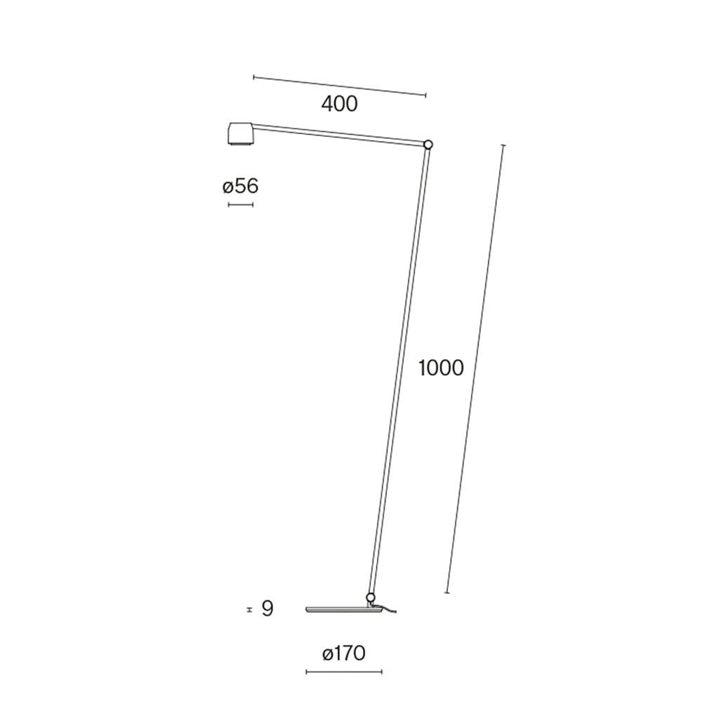 Sorgente luminosa: COB LED (incluso) 8.2 W 3000k – 100–240V- 574 lumen – dimmerabile – CRI97 – IP20. Dimensioni: Ø 56mm – Ø base 170mm – H 1000 mm x L 400mm