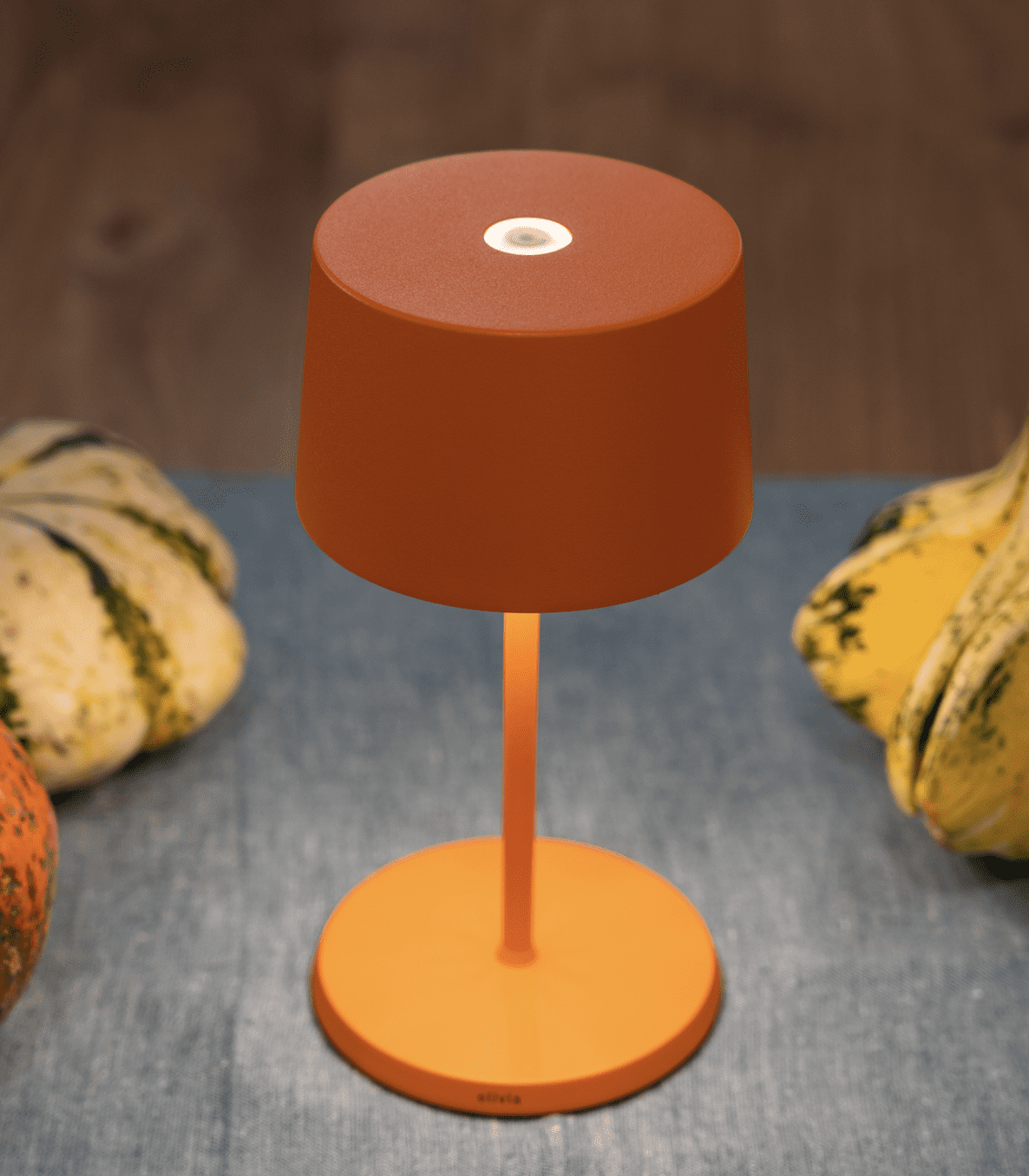 Olivia mini è una lampada da tavolo a batteria, portatile e ricaricabile. Nella parte superiore della testa è presente