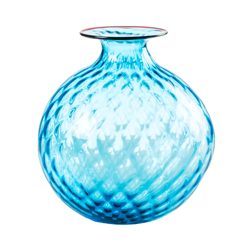 Sembra morbido, eppure è vetro. L’illusione ottica del Monofiori di VENINI del 1970 è nel suo nome: Balloton, la lavorazione unica che ricrea sulla superficie l’effetto matelassé. L’opera è lavorata a mano, soffiata nel caratteristico stampo in metallo e finita nel collo sottile con un filo colorato applicato a caldo, che varia nel colore.