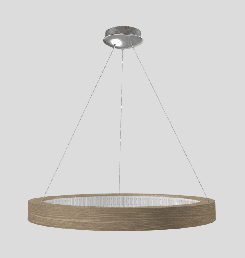 Lampada in legno di rovere naturale. La diffusione della luce è amplificata da losanghe di cristallo opache. Base in metallo cromato.