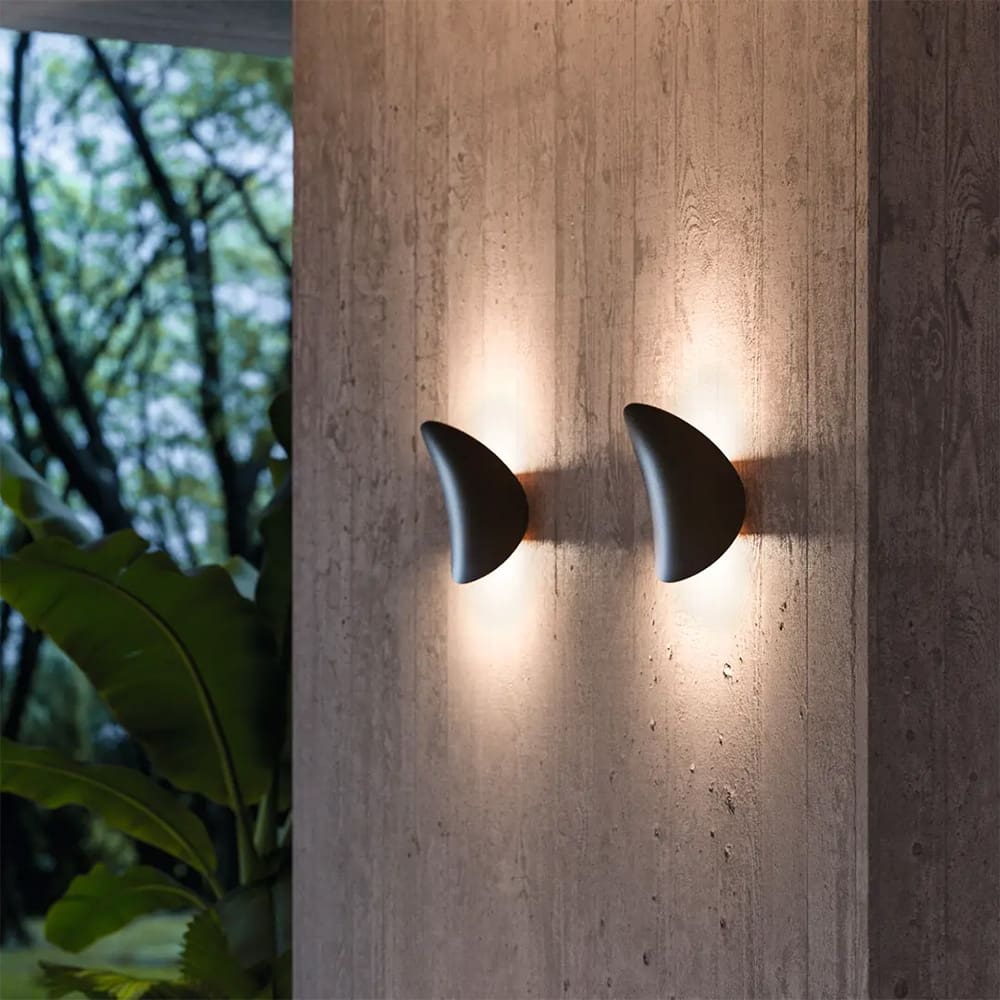 Alba W65, una lampada da parete per ambienti outdoor, con corpo e montatura in alluminio verniciato marrone scuro o grigio raggrinzante e diffusore in vetro trasparente. È possibile orientare la lampada per adattarla a qualsiasi esigenza, scegliendo di avere più luce verso il basso o verso l’alto, grazie alla doppia superficie installativa. Il grado di protezione è IP65. Si può modificarne la posizione in ogni momento: ruotandola di 180° si trovano due ulteriori tipologie di posizionamento e luce, diverse dalle precedenti.