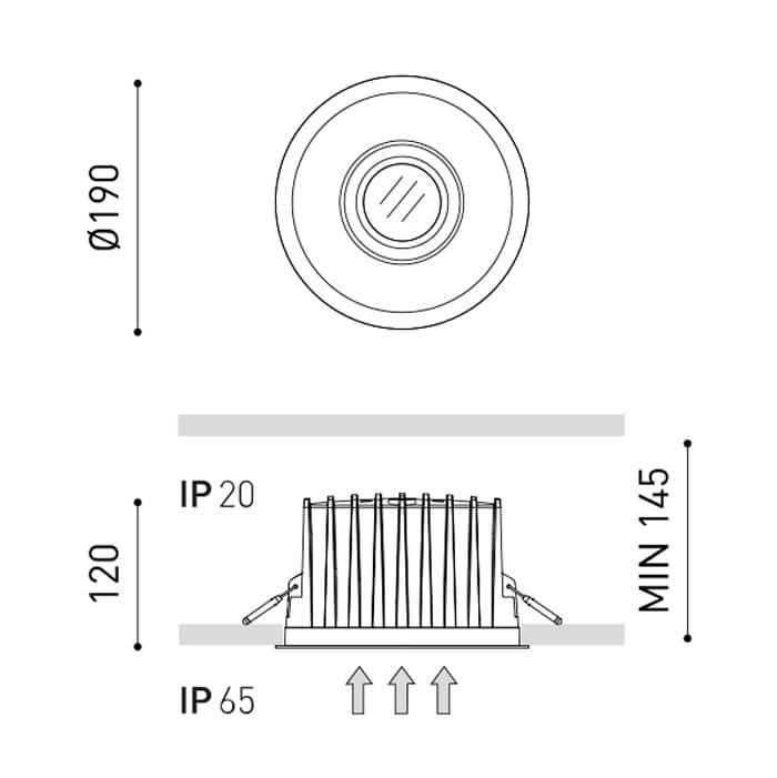 Sorgente luminosa: LED 41W 3000k – 5100 lumen – 42° – CRI>90 – IP65/65 – non dimmerabile – Dimensioni: incasso Ø177mm