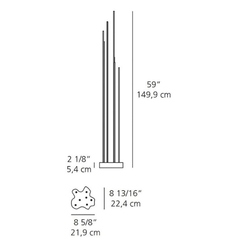 Reeds è un apparecchio di illuminazione da terra a luce diffusa che impiega sorgenti a LED monocromatici. Disegnato da Klaus Begasse per il marchio Artemide, Reeds è disponibile con gradi di protezione IP20 per interno, IP67 e IP68 per esterno. Le versioni IP67 e IP68 sono disponibili in forma Singola o Tripla. La luce si diffonde attraverso 7 aste in PMMA aventi altezze diverse per dare l’impressione di un canneto e avvitabili alla base grazie a bussole in acciaio INOX AISI 316. Parte della luce si diffonde sul suolo anche attorno alla base stessa. La base, di forma irregolare, è studiata per consentire l’incastro «a mosaico» con altri apparecchi in modo da creare una composizione articolata a piacimento. Composto da una base costituita da un involucro in policarbonato trasparente montato tra 2 piastre in acciaio INOX AISI316 serrate con viti in acciaio INOX AISI316 . La tenuta all’acqua è garantita da una guarnizione siliconica. L’apparecchio può essere fissato a terra grazie ai fori inseriti nella piastra inferiore. Coperchio estetico in tecnopolimero. Completo di alimentatore integrato e fornito con 1,5 m di cavo H05RN-F 2×1 provvisto di connettore IP67 per la connessione elettrica alla rete idoneo per cavi di diametro 5-13,5mm.