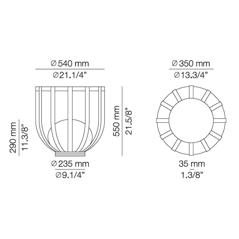Sorgente luminosa: LED 10W 2700K – Ang. 120º – >90 CRI – 230V – 870 lumen – Triac dimmerabile. IP65. Dimensioni: Ø 540 mm – H. 550 mm