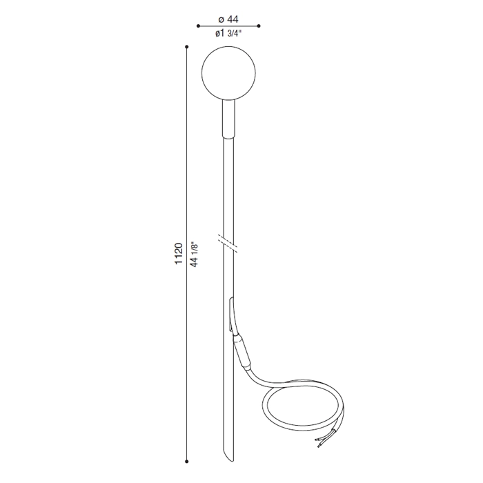 Sorgente luminosa: LED 1,5W 24V (driver escluso) 3000k – 133 lumen – IP 66. Dimensioni: ø 44mm H1120mm. Cavo 3m PVC 2×0,25mm.