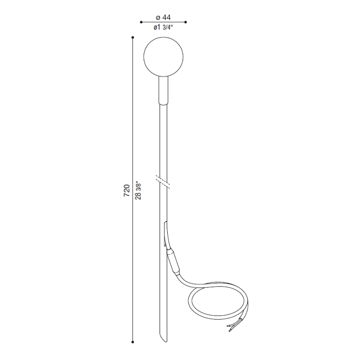 Sorgente luminosa: LED 1,5W 24V (driver escluso) 4000k – 140 lumen – IP 66. Dimensioni: ø 44mm H720mm. Cavo 3m PVC 2×0,25mm.