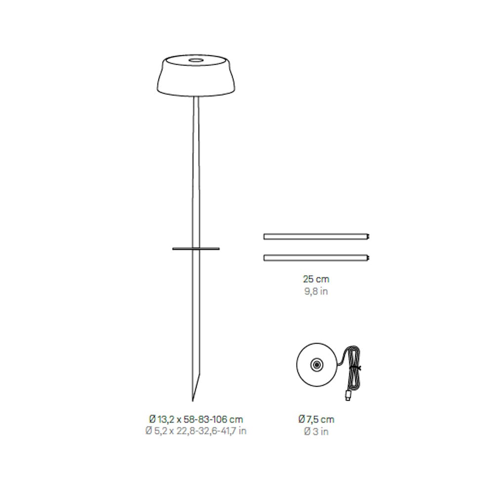 Sister Light Wi-Fi è una lampada a batteria, portatile e ricaricabile, controllabile anche da remoto (Wi-Fi 2,4GHz) grazie all’app Zafferano Lighting (Apple Store e Play Store). Un controllo “touch” presente nella parte superiore della testa permette accensione, dimmerazione a 4 step (100%, 60%, 30% e 6%) e selezione della temperatura di colore della luce tra 2200K, 2700K, 3000K e 4000K. L’app permette molti controlli addizionali. Grazie all’indice di protezione IP65, è utilizzabile anche all’esterno; è inoltre resistente alla nebbia salina (1500 h); é fornita con un kit di 2 aste che permette di configurare l’altezza in tre misure: 58, 83 o 106 cm. Tutti i modelli si ricaricano svitando la testa e ponendola sulla base di ricarica a contatto, inclusa. Caricabatterie non incluso.