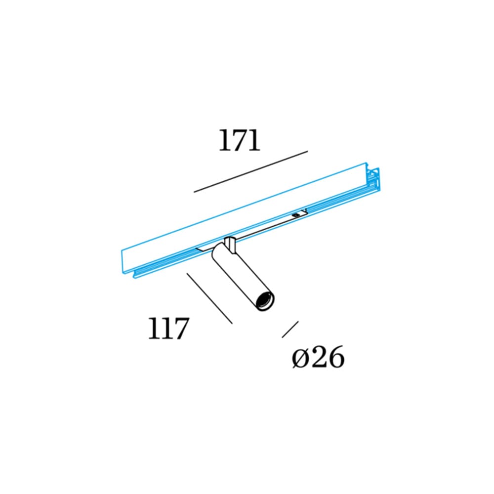 Sorgente luminosa: COB LED 7W – 2700K – 530 lumen – CRI≥90 – 48V – Dimmer DALI-2 – IP20. Dimensioni: H 117 mm L 171 mm Ø 26 mm