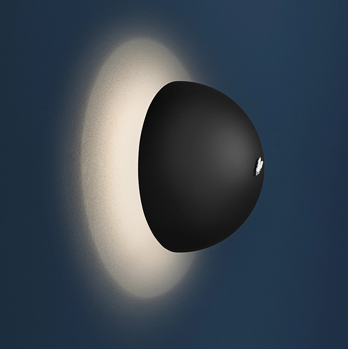Ale W è una semisfera nella sua forma più pura. Può essere distanziata dalla parete, variando il diametro del cerchio luminoso prodotto sulla parete. Blu, giallo, rosso, ma anche sfumature fluo come rosa, giallo blu e arancio, colorano semisfere, aste, basi e dettagli ironici, regalando un tocco vivace all’ambiente. La semisfera diventa l’elemento distintivo della linea Ale, declinata in quattro differenti modelli, tutti caratterizzati dal dettaglio ironico di una mosca poggiata sulla calotta.