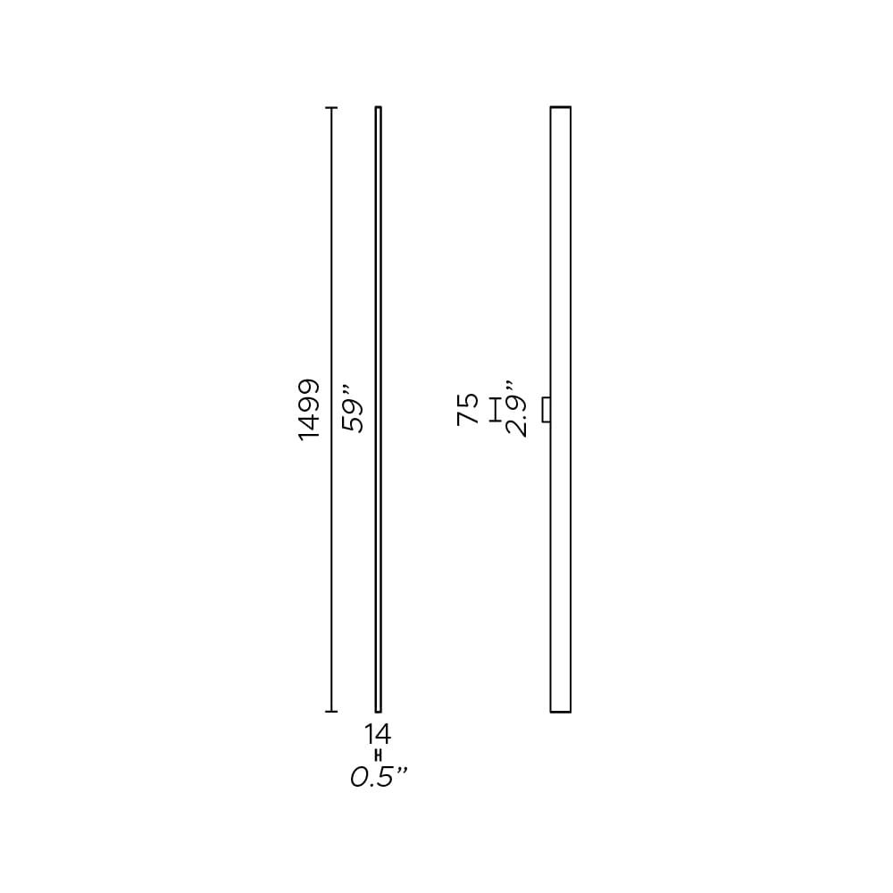 Sorgente Luminosa: Fronte: 1 x 20W Strip LED – 2360 lumen – Retro: 2 x 14W Strip LED – 3290 lumen – 2700 K – CRI>90 – 220/240 V – Dimmerabile a taglio di fase/Triac – IP20. Dimensioni: H 1499 mm L 14 mm W 69 mm