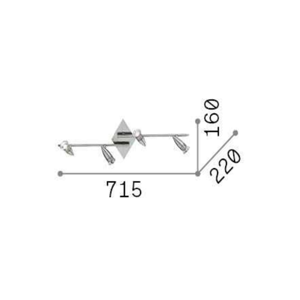 Sorgente Luminosa: GU10 max 4 x 50 W (E14 OLIVA 4W, lampadina inclusa) – 3000 K – 220-240V – Dimmer determinato dalla lampadina – CRI=80 – IP20. Dimensioni: L 715 mm W 220 mm H 160 mm