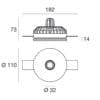Sorgente luminosa: 1 x powerLED 9 W DC 24 V – 3000K – 520 lumen – IP40 – CRI90. Dimensioni: L 182 mm Ø 110 mm W 73mm
