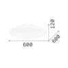 Sorgente Luminosa: E27 max 3 x 60 W (lampadina non inclusa) – 220-240V – dimmer determinato dalla lampadina- IP20. Dimensioni: H 120 mm Ø 600 mm