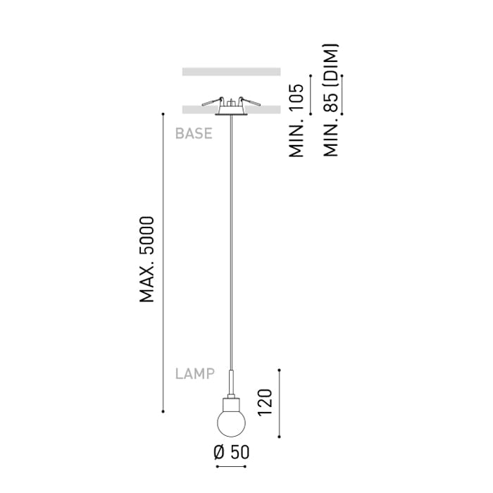 Sorgente luminosa: LED 4,5W 3000k – 500 lumen – 21° – CRI>90 – IP20 – non dimmerabile – Dimensioni: Ø50mm. Lunghezza del cavo max 5m