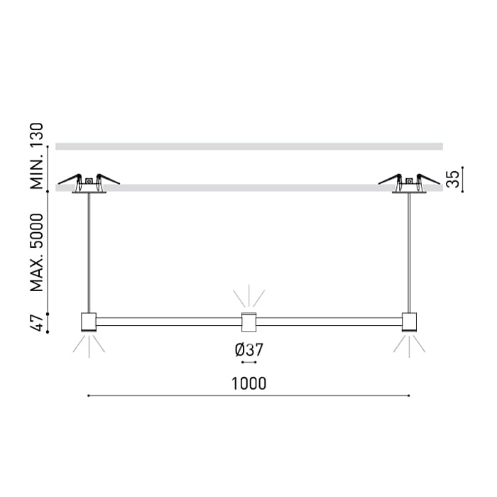 Sorgente luminosa: LED 6,3W 3000K – 630 lumen – 38°- CRI>90 – IP20 – non dimmerabile. Dimensioni: L 1000mm, incasso 2 x Ø50mm. Lungheza del cavo max 5m