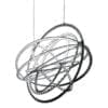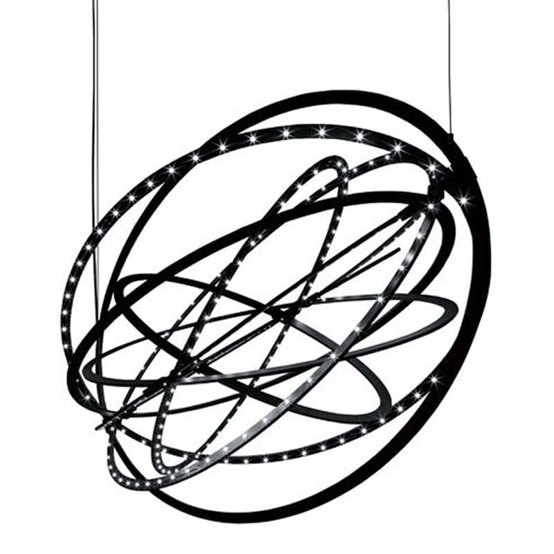 Lampada a sospensione, coordinata con il modello di lampada da parete. Nove ellissi concentriche mobili ottenute da una singola piastra di alluminio supportano un circuito di 384 LED bianchi; le ellissi ruotano in modo indipendente su due assi diversi, consentendo di dirigere l’emissione di luce e di ottenere contemporaneamente numerose configurazioni spaziali. Quando il dispositivo è chiuso, è completamente piatto.