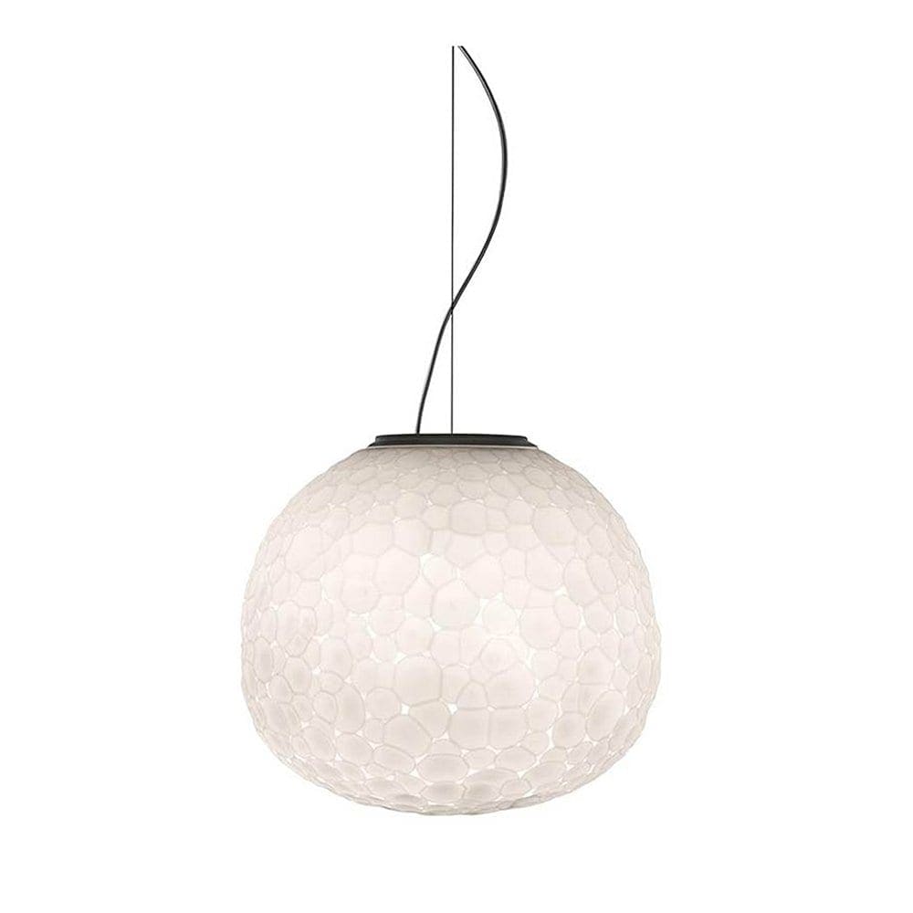 “Meteorite nasce dalla ricerca di una nuova sensibilità, un nuovo linguaggio espressivo per l’illuminazione del vetro soffiato. Il punto di partenza è stata la nostra fantasia per il vetro “battuto” veneziano, per l’effetto levigatura e per il forte fascino della sensazione “incompiuta” che questo tipo di processo porta al vetro. Abbiamo progettato uno speciale processo di soffiatura e macinazione del vetro, che consente di ottenere una profondità di illuminazione impressionante nell’oggetto illuminato e di rendere questa bellezza accessibile o – potremmo dire – democratica. ”Pio e Tito Toso. Una famiglia di lampade composta da quattro tipi diversi, con un diffusore in vetro artistico a doppio strato ottenuto per mezzo della tecnica artigianale di soffiaggio del vetro continuo seguita dalla glassa.