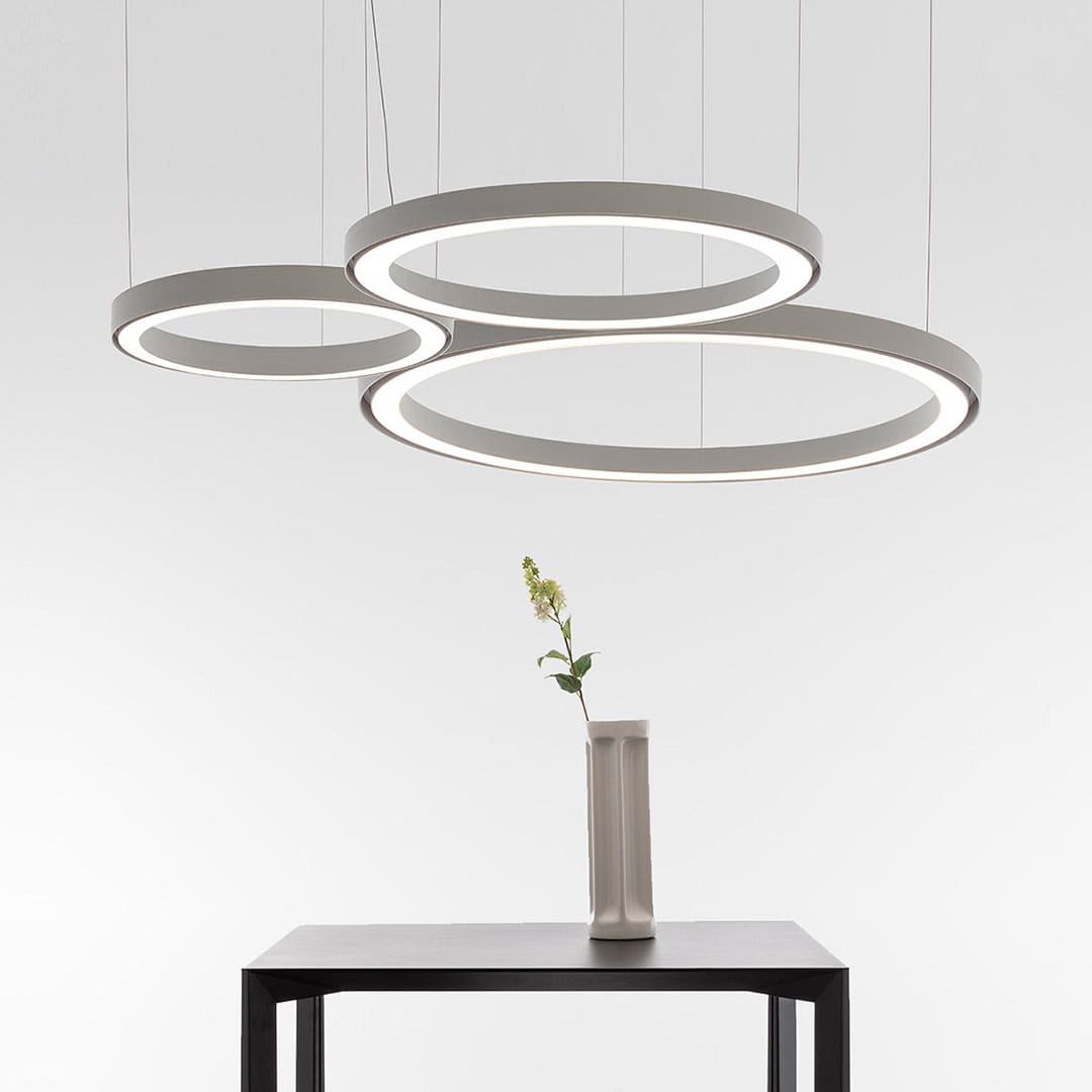 Ripple di Artemide, progettata da BIG – Bjarke Ingels Group, è una lampada a sospensione modulare che integra luce e comfort acustico. Questo sistema versatile consente di creare configurazioni luminose personalizzate, adatte sia a spazi semplici che a soluzioni scenografiche più complesse. Composto da strutture circolari in tre diversi diametri, Ripple può essere combinato in forme lineari o libere, mentre il diffusore opzionale fornisce anche proprietà di assorbimento acustico, migliorando il benessere negli ambienti. Il profilo ottico avanzato integra ottica e meccanica, assicurando un’illuminazione uniforme. Gestibile tramite Artemide App, il sistema offre flessibilità nell’impostazione dell’illuminazione, rendendolo ideale per progetti che richiedono design, innovazione e funzionalità.