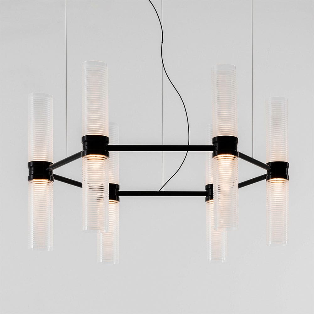 Zephyr è un lampadario minimalista ed elegante, disegnato da Carlo Colombo e prodotto dal marcio Artemide, dotato di una struttura modulare che consente di realizzare infiniti layout personalizzati in base alle esigenze di ogni progetto. L’elemento modulare è un doppio diffusore cilindrico con un corpo centrale che racchiude le sorgenti luminose e, attraverso due anelli che ruotano sullo stesso asse, definisce la posizione dei corpi illuminanti vicini posizionando gli elementi strutturali di collegamento. Il diffusore è in vetro trasparente soffiato a mano in uno stampo dalla forma ondulata i cui vertici vengono poi molati per creare una texture orizzontale che alterna strisce trasparenti e opaline di diffusione. Questa lavorazione arricchisce elegantemente il diffusore, ma soprattutto crea una diffusione della luce non abbagliante lungo il corpo cilindrico. Si tratta di un’interpretazione contemporanea del lampadario tradizionale: l’artigianalità del vetro si unisce alla semplicità della forma e all’estro ottico per reinterpretare le tecnologie di lavorazione del vetro, non solo come elementi decorativi, ma anche come strumenti funzionali per il controllo e la distribuzione della luce.