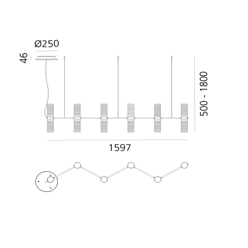 Sorgente Luminosa: LED 80 W – 3000K – 4950 lumen – CRI=90 – dimmerabile Push – IP20. Dimensioni: L 1597 mm H máx. del soffitto 1800 mm