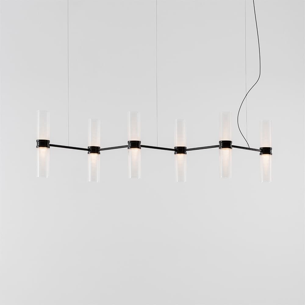 Zephyr è un lampadario minimalista ed elegante, disegnato da Carlo Colombo e prodotto dal marcio Artemide, dotato di una struttura modulare che consente di realizzare infiniti layout personalizzati in base alle esigenze di ogni progetto. L’elemento modulare è un doppio diffusore cilindrico con un corpo centrale che racchiude le sorgenti luminose e, attraverso due anelli che ruotano sullo stesso asse, definisce la posizione dei corpi illuminanti vicini posizionando gli elementi strutturali di collegamento. Il diffusore è in vetro trasparente soffiato a mano in uno stampo dalla forma ondulata i cui vertici vengono poi molati per creare una texture orizzontale che alterna strisce trasparenti e opaline di diffusione. Questa lavorazione arricchisce elegantemente il diffusore, ma soprattutto crea una diffusione della luce non abbagliante lungo il corpo cilindrico. Si tratta di un’interpretazione contemporanea del lampadario tradizionale: l’artigianalità del vetro si unisce alla semplicità della forma e all’estro ottico per reinterpretare le tecnologie di lavorazione del vetro, non solo come elementi decorativi, ma anche come strumenti funzionali per il controllo e la distribuzione della luce.