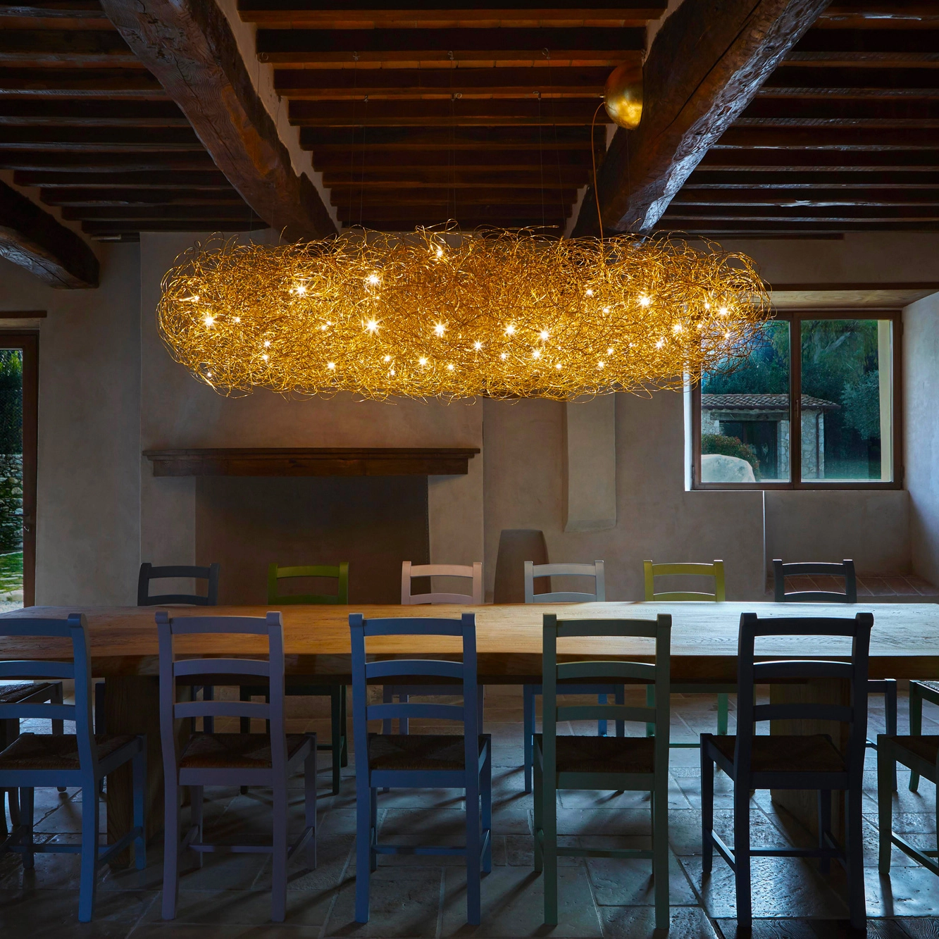 Fil de Fer Nuvola è una lampada a sospensione in filo di alluminio modellato ed intrecciato. Pensata e realizzata da Enzo Catellani è la sua creazione a lui più cara.