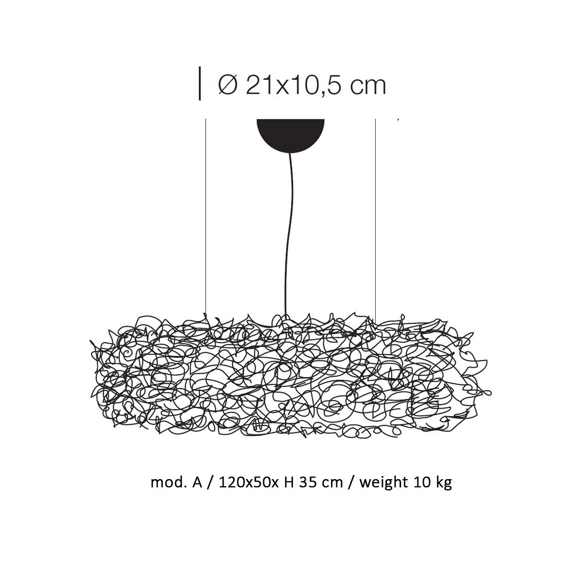 Sorgente Luminosa: LED G4, 110V o 240V, 12V, DC 24x1W, K 2700 – lumen 1800 – CRI >80 – 110V o 240V – Triac dimmerabile – Dimensioni: 120x50xH35 cm ca. base Ø 21×10,5 cm, cavi sospensione 170 cm tagliabili a misura, misure alternative disponibili a richiesta