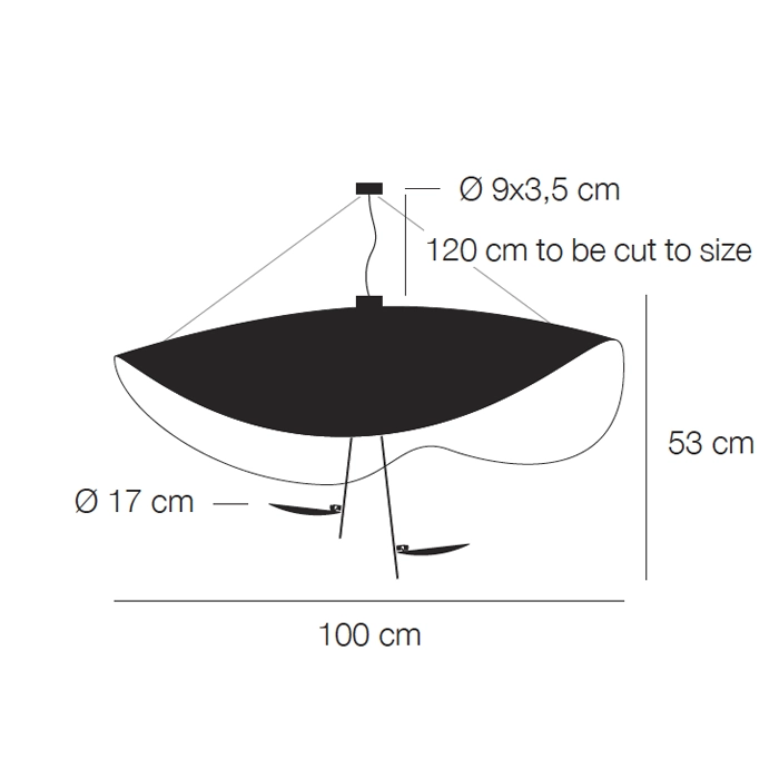 Sorgente luminosa: modulo LED 2x17W 2700k – lumen 3400 – CRI >80 – 240V dimmerabile. Dimensioni: base ร 9ร3,5 cm, cavo sospensione 120 cm tagliabile a misura, schermo ร 100 cm, H 53 cm, disco orientabile ร 17 cm
